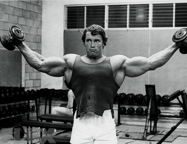 Пожалуй, самое уникальное упражнение это то, что названо в мою честь – жим Арнольда. Как оно выполняется? Вы становитесь в начальную позицию, руки согнуты в локтях, расположенных параллельно, ладони обращены внутренней стороной к вашему лицу, гантели держите на уровне вашего подбородка. Вначале вы разводите руки, разворачивая их таким образом, чтобы ладони оказались к вам тыльной стороной. После этого вы выталкиваете гантели вверх, полностью распрямляя руку в локте. Упражнение можно выполнять как сидя, так и стоя. Низкая отправная точка упражнения предполагает большой диапазон движения руки. Как следствие, больше мышц включается в работу и куда больше получают для своего развития дельтовидные передние мышцы. Жим Арнольда прорабатывает сразу три пучка дельтовидных мышц и считается одним из самых лучших формирующих упражнений. Делая жим, вы будете чувствовать, как мышцы уплотняются, отделяются от прочих и становятся заметными.