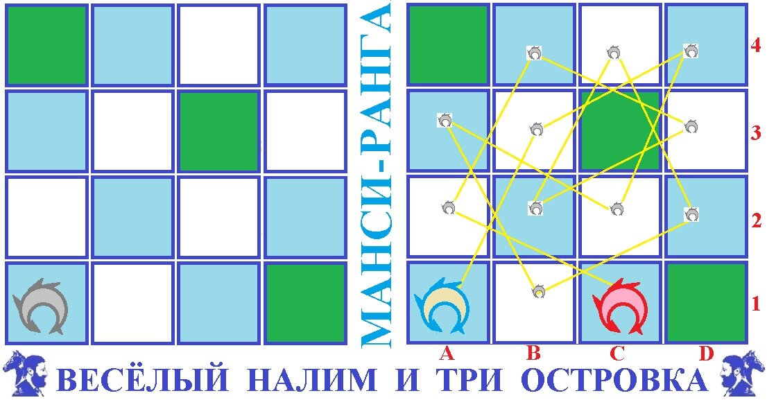 Доска – река. Три зеленые клетки – три островка. Ведущий накрывает островками два произвольных угловых поля и третьим островком любое свободное поле. Возможно применять кубик. Стартовое положение налима также определяется кубиком или ведущим. Играет один ребёнок. Налим ходит ходом коня в шахматах («Раз, два, вбок») Задание: обойти всю доску побывав на каждом поле только один раз (пройденые поля можно метить фишками, монетками, камешками, семечками и т.п.) Чем больше полей включено в маршрут, тем выше результат. В случае соревнований, сравниваются маршруты, найденные участниками за определенное время. Хорошая версия – баттлы – поединки, когда за пару минут необходимо построить маршрут. Победитель выходит в следующий круг.
