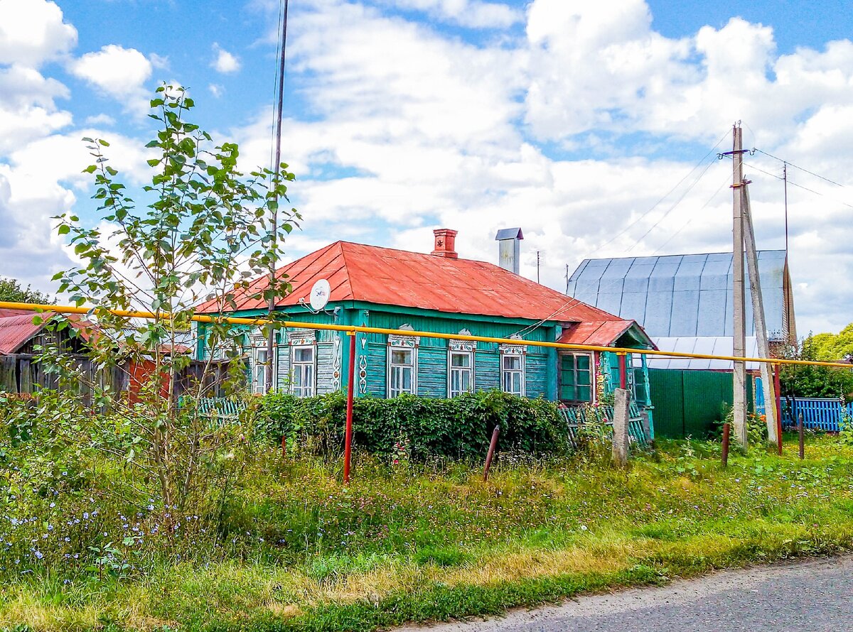 Кстати, в Алкужинских Борках есть и кирпичные здание. Но все они тоже имеют свою определенную красоту. Вот, например, этот домик с красивыми узорами на стенами.