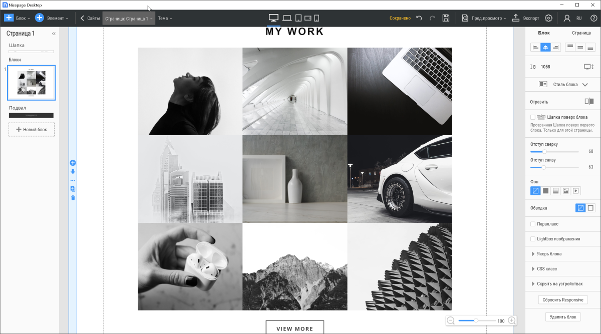 В шапке Nicepage вам нужно просто переключиться на нужный тип устройства, и вы сразу же увидите, как ваш сайт будет выглядеть на нём.