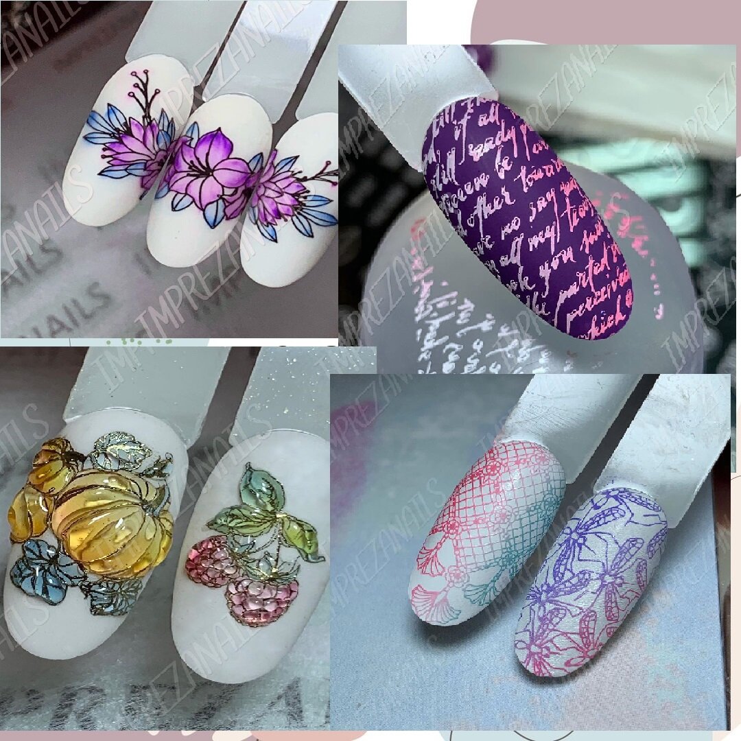 Если делаете гель-лаком или гель-краской, то штамп матируем спиртосодержащей жидкостью, подходит обезжириватель, но не жидкостью для снятия лака. Если краска жидкая, не плотно пигментирована, то нужно подсушить в УФ лампе несколько секунд прежде, чем переводить на ноготь, чтобы рисунок не разъезжался. Гель-лаки нужно всегда немного подсушивать. Главное поймать момент, чтобы не присох к штампу, многое зависит от вашей лампы. Нужно пробовать и приноравливаться. Гель-лаки нужно всегда немного подсушивать, переносим на ноготь перекатывающим движением. Можно сделать пару ногтей одним отпечатком. Гель-краска более пигментирована, чем гель-лак. Отпечаток четче, но и более прозрачный дизайн гель-лаком тоже может быть хорош. Также работая гель-лаками и гель-красками трафарет можно раскрашивать разными цветами.