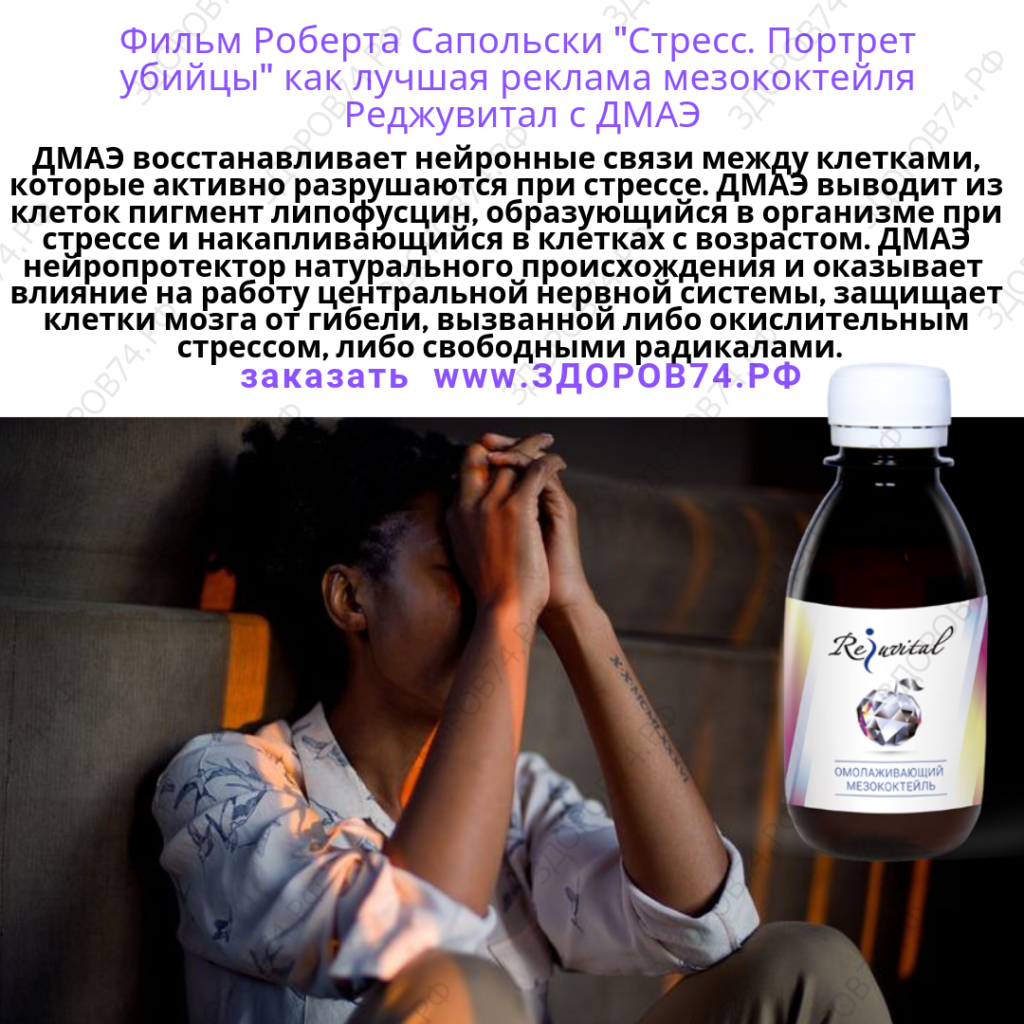 Эти моменты рассмотрены в фильме «Стресс. Портрет убийцы» Роберта Сапольски – биолога, невролога и нейрохирурга, преподавателя Стенфордского университета. И вот почему мы выкладываем его на нашем сайте: это ЛУЧШАЯ РЕКЛАМА для линейки мезококтейлей с ДМАЕ. Что такое это ДМАЭ подробно расписано в другой нашей статье. Но почему Мезококтейль Реджувитал с ДМАЭ влияет на сердечно-сосудистую систему? Или как Мезококтейль Реждувитал ДИА способствует похудению? Каким образом Мезококтейли Реджувитал способствуют восстановлению режима сна и бодрствования? И почему омолаживающие мезококтйли называются омолаживающими и показаны в комплексной терапии при любом заболевании любого органа или системы?
