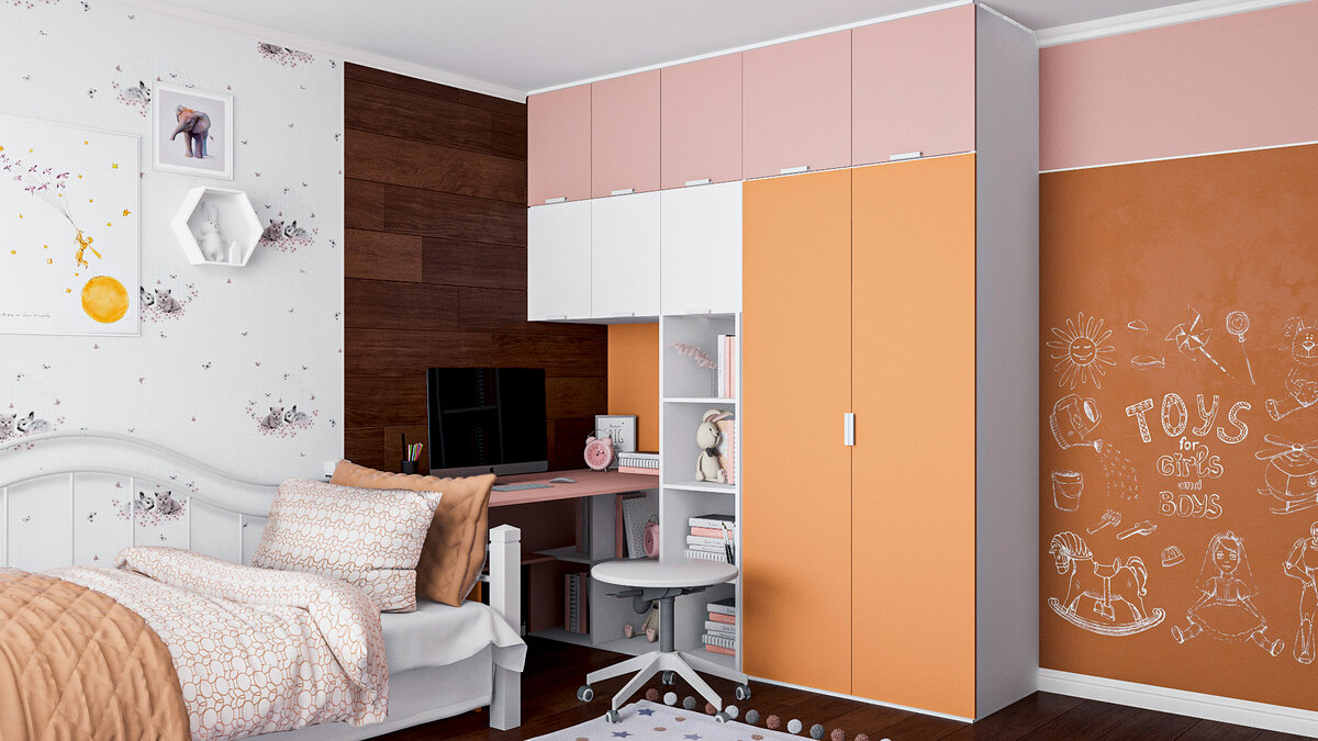 Чтобы максимально эффективно использовать ограниченное пространство, распашной шкаф застроен от пола до потолка. На полках можно хранить игрушки, книги, школьные принадлежности, канцтовары. В верхних шкафах идеально поместятся вещи которыми ребенок пользуется не часто, а в большом распашном шкафу отлично разместится одежда и обувь.