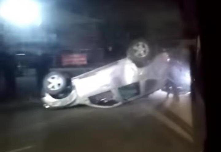Врезалась в дорожный знак и опрокинулась иномарка в Биробиджане