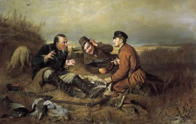 При первом взгляде на картину В.Г.Перова «охотники на перевале» все внимание приковывает трое мужчин—это охотники. Глядя на них можно сказать , что они разного возраст. Тот, который по старше одет в высокие чёрные сапоги , серые брюки в клеточку и в чёрное длинное пальто. На его лбу глубоки морщины. По его мимике можно понять, что он пытается донести информацию своим друзьям.