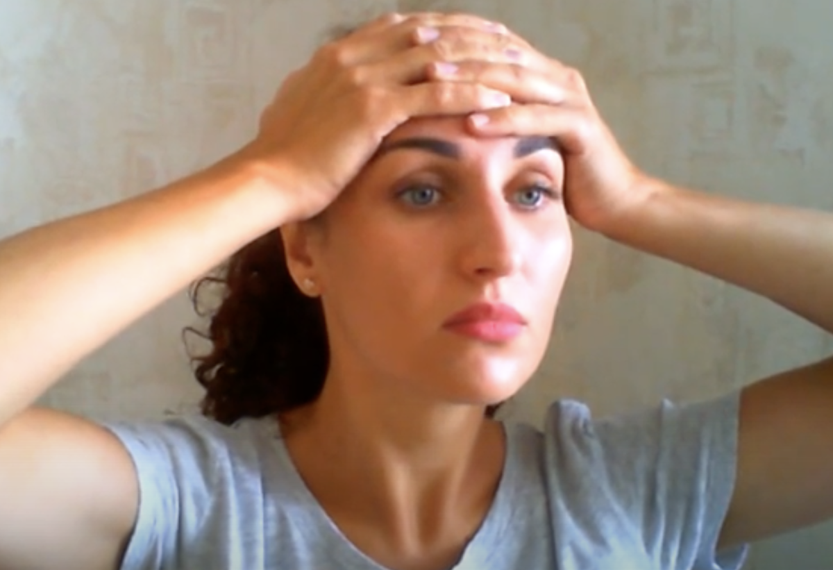 Полностью расслабьте лицо и тело, выполняйте все упражнения сидя. Начните удивлённо поднимать-опускать брови. Для верного фиксирования мышц лба, положите руки на лоб, расположив пальцы в шахматном порядке.