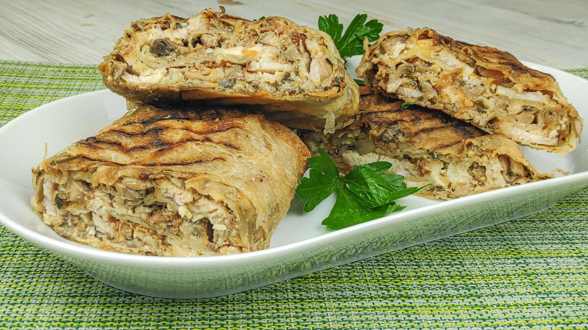 это рулет из лаваша, в который, на этот раз, заворачиваем жареные с луком грибочки🍄😆 (можно сдобрить их жирными сливками), ломтики куриного филе и натёртый сыр🧀.