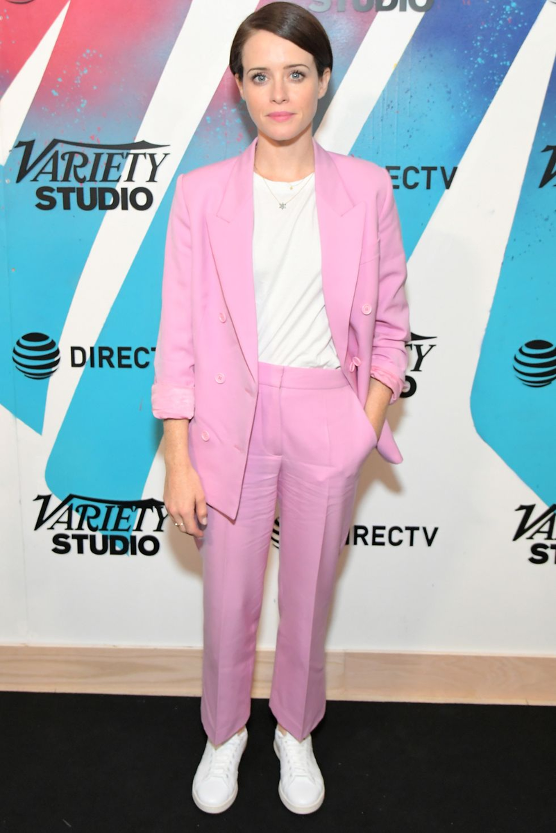 Подсказка к теме песни Miami Vice ! Этот костюм конфетного цвета от Клэр Фой по-прежнему актуален в 2020 году благодаря красивому крою и нежному цвету. Носите его с высокими кроссовками или наденьте модные каблуки.