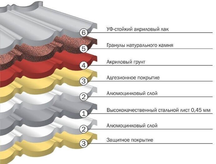 Основу композитного модуля составляет стальной лист толщиной 0,45 мм (1) покрытый алюмоцинковым слоем (2). Поверх алюмоцинка снизу наносится защитное покрытие (3), сверху – адгезионный состав. Верхняя сторона модуля затем обрабатывается грунтом на акриловой основе, покрывается посыпкой из каменных гранул. Поверх гранулята накладывается акриловый лак, обладающий стойкостью к ультрафиолету.