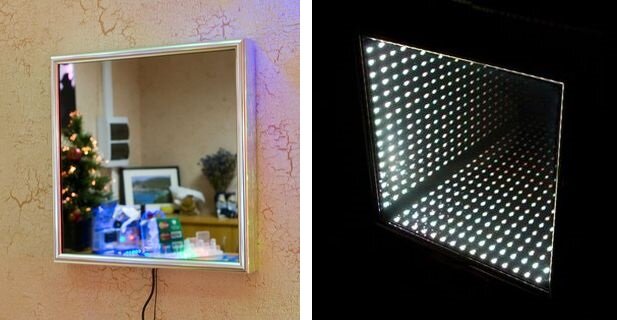 Декоративный светильник-зеркало. Между зеркалом и полупрозрачным зеркалом находятся светодиоды: