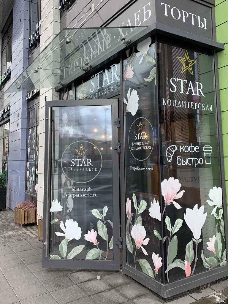 Маленькая кондитерская с немного странным для французской кондитерской названием "Star"на углу дома № 10 к. 1 по проспекту Медиков в Санкт-Петербурге из ряда заведений, расположенных в тесном соседстве, привлекает с улицы разве что нежными пастельными розовыми цветами на стекле да легким, едва уловимым запахом теплого хлеба. Никаких кричащих вывесок, модных нынче огонечков - скромно и просто.