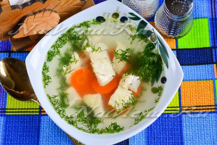 🥣Нарезанную курицу и несколько кусочков отварной морковки кладу в тарелочку. Наливаю сверху бульон. Присыпаю свежепорубленным укропом