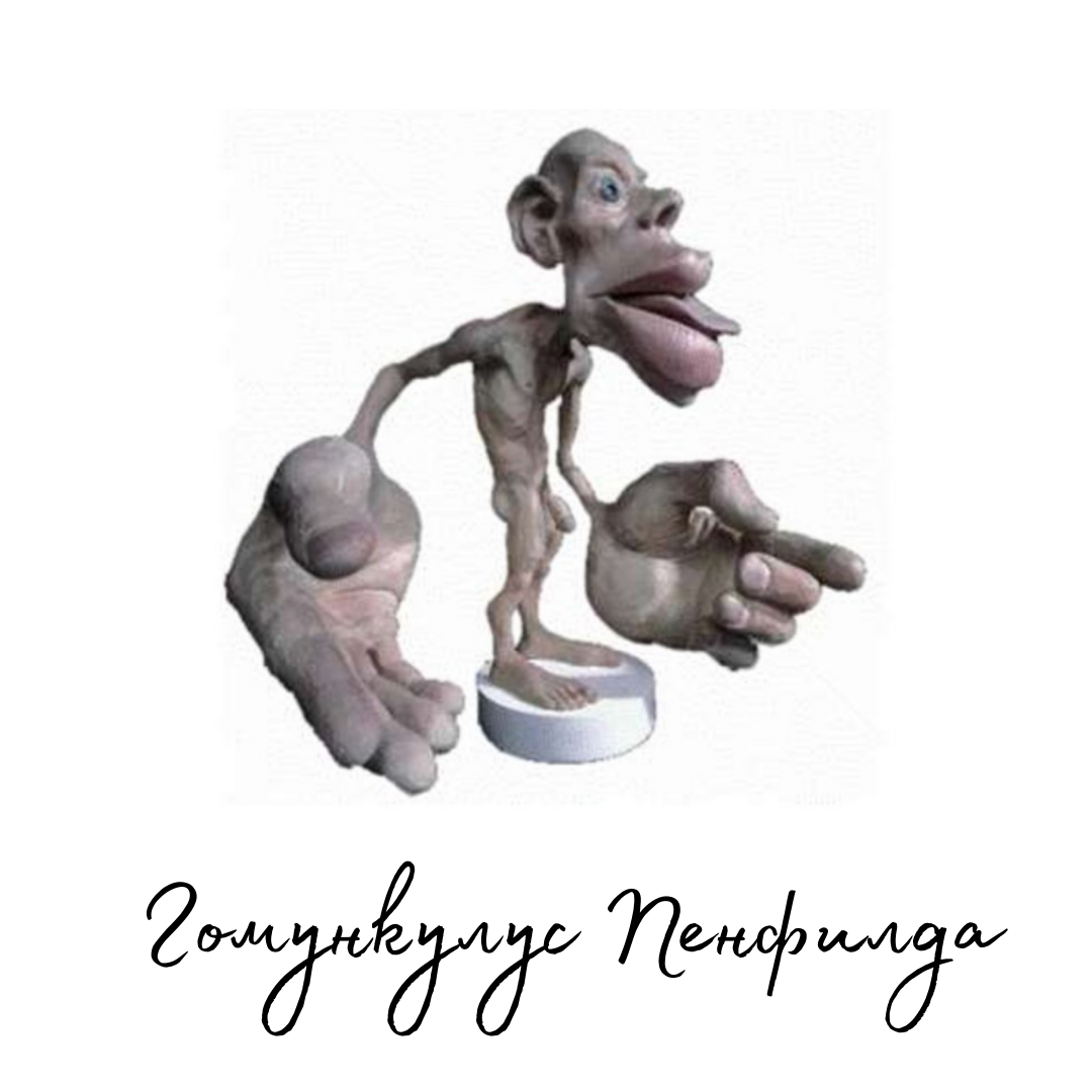 В середине прошлого века канадский нейрохирург Уайлдер Пенфилд составил функциональную карту головного мозга, на которой он отметил какие участки мозга отвечают за те или иные мышцы в нашем организме. Выяснился интересный факт - мозг «видит» тело совершенно не так, как оно выглядит в реальности. Для наглядности было создано изображение человека, который и называется гомункулусом, где части тела соответствуют степени их представленности в головном мозге. Выглядит этот персонаж по крайней мере неправдоподобно. Но по этому изображению легко понять, что с точки зрения сенсорного восприятия наибольшая роль отводится кистям рук (почти 1/3), затем примерно столько же области рта, включая губы, рот, гортань. Остальные части тела непропорционально малы.