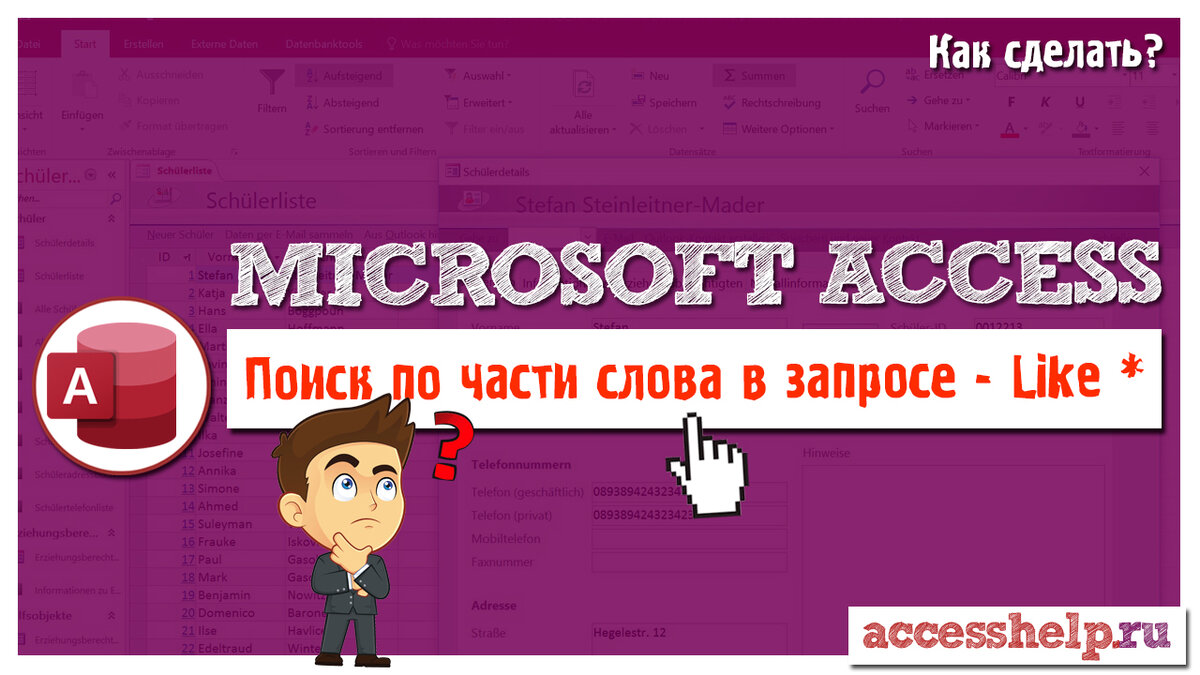 Если вы не знаете как сделать поиск по части слова в программе Microsoft Access, то посмотрите это видео.