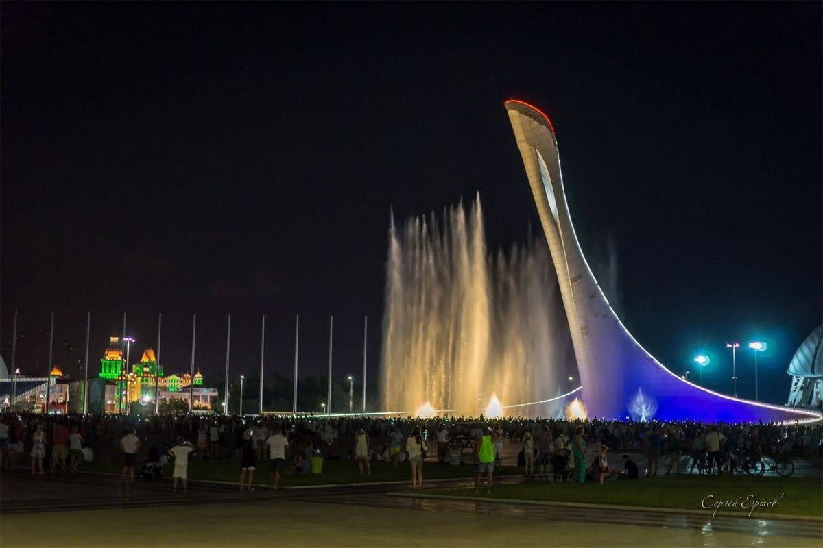 Поющие фонтаны- одна из главных достопримечательностей Сочи. Он представляет собой форму жар-птицы, которая обнимает крыльями чашу с водой. Играет классическая музыка и фонтан подсвечивается огнями. Очень красивое зрелище!
