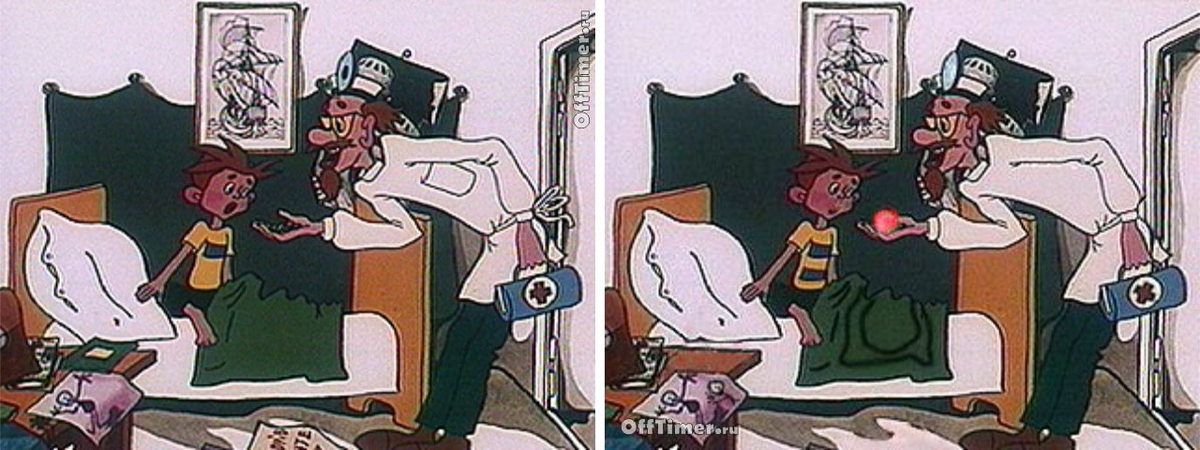 Друзья, перед вами классическая задачка из детской серии "Найди отличия на 2-х мультяшных картинках". Основой выпуска стал замечательный и поучительный мультфильм "Зеленая пилюля", показывающий, как плохо хитрить, даже если нет желания идти в школу.... Но не будет пересказывать, а перейдем к головоломке: