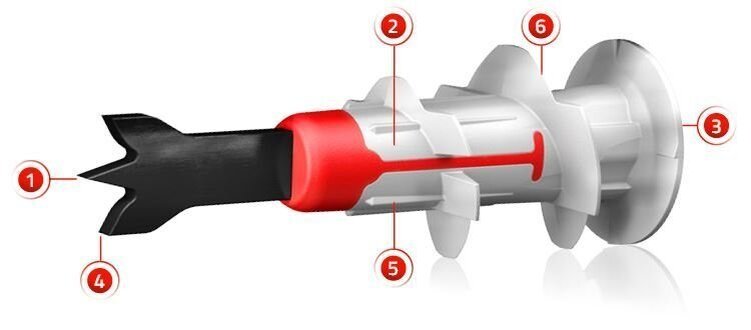 Дюбель состоит из металлического носика, который отламывается при установке шурупа. При заворачивании, вертыш "раскрывается" в разы лучше своих аналогов. Он имеет самый распространенный шлиц Phillips (PZ 2) для удобного монтажа большинством инструментами. Носик дюбеля, который производит само сверление с тремя точками опоры, создает быстрое и качественное формирование отверстия. На дюбеле так же присутствуют дополнительные ребра, предназначенные против прокручивания. Вертыш очень плотно садится в отверстии.
