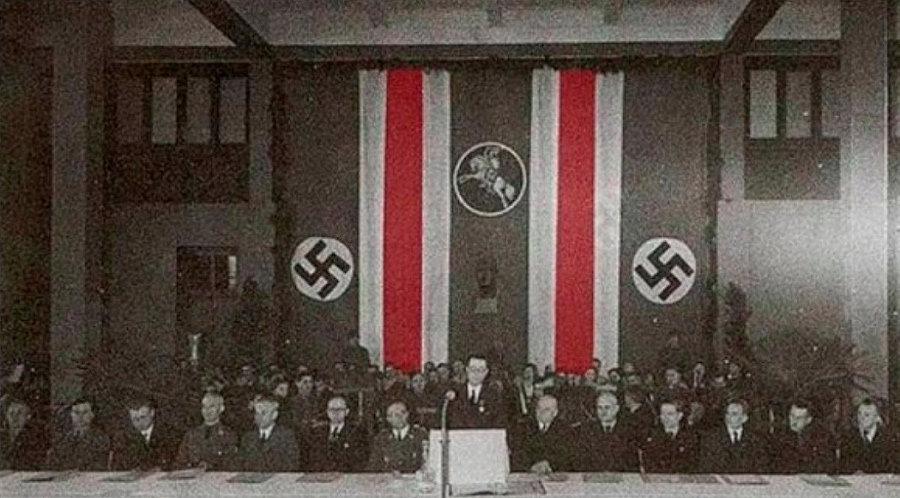 После захвата Минска гитлеровскими войсками здание Минского городского театра (нынешнего Купаловского) было постоянно «украшено» бело-красно-белой символикой.