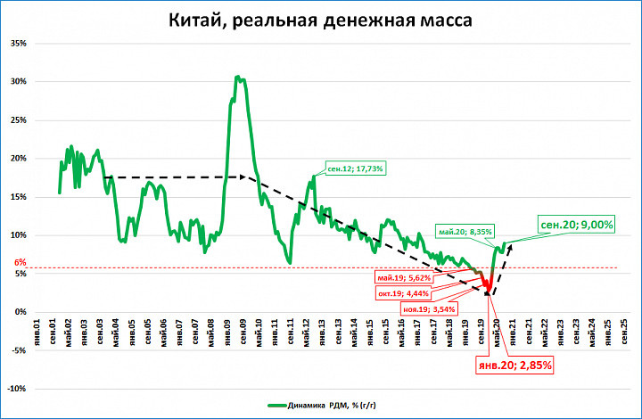 Нечто необычное происходит сейчас в денежной политике этой страны. Темпы реальной денежной массы там непрерывно снижались с сентября 2012 года. В мае 2019 года (задолго до коронакризиса) темпы опустились ниже 6%, то есть отметки, ниже которой не опускались десятки