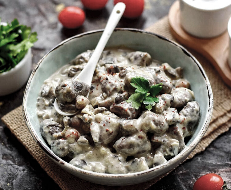 Все довести до полу готовности,после чего смешать вместе в глубокой сковороде,залить водой,накрыть крышкой и уменьшить нагрев на 10-15 мин.После чего влить в сковороду сливки,все чательно перемешайте,при необходимости добавьте соль.Соус необходимо немного выпарить.После добавления сливок готовьте на среднем нагреве еще 10 мин.