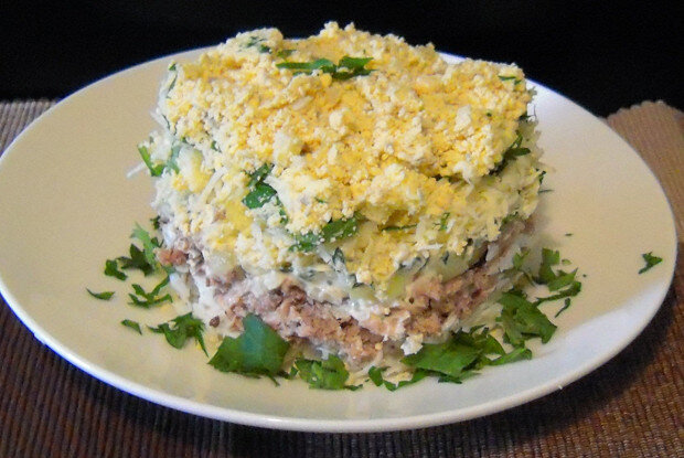 Чистим и режим лук, а потом наносим его на майонез. На новый слой лука нужно положить еще один слой майонеза.