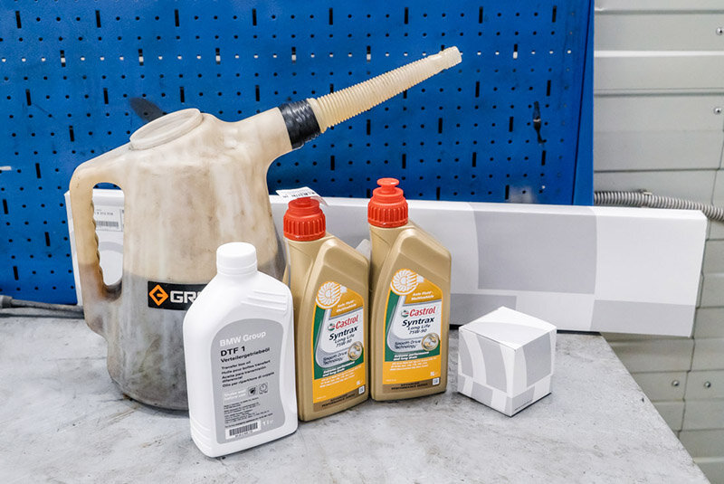 Также было слито трансмиссионное масло в переднем и заднем редукторах. Для заправки раздаточной коробки использовалась оригинальная трансмиссионная жидкость BMW DTF1, а в редукторы мы залили рекомендованное масло Castrol Syntrax Long Life 75W-90.