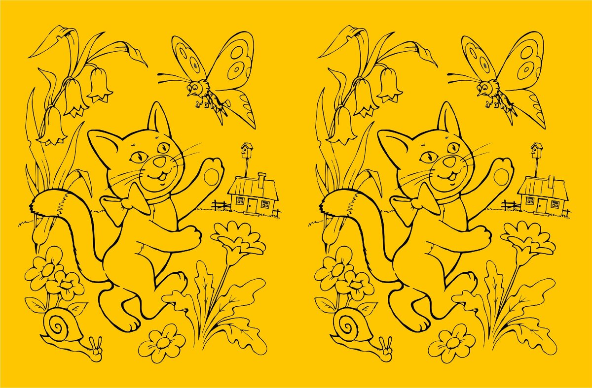 Одна пара картинок – мальчик-рыбак с котом проказником. Другая пара рисунков – романтическая кошка, играющая с бабочкой на фоне сельской природы. Картинки откровенно расслабляют, в этом и сложность добавляется. Попробуйте разыскать в симпатичных героях по 3 отличия на каждой группе.