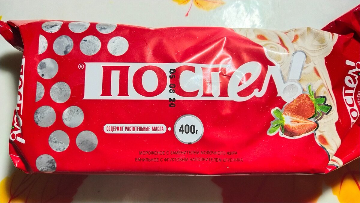 Увидела мороженое, от фирмы "поспел!" В Светофоре, решила купить посмотреть какой состав и как оно выглядит, заодно и на вкус попробовать. Мороженное с ЗМЖ 400гр 39.9р. Цена очень демократичная, в сетевых магазинах такое дороже. Состав стандартный для такого продукта, основа сахар, вода и растительные жиры, клубничная начинка непонятно из каких фруктов с пектином сделана, но есть краситель и ароматизатор, так что вид и запах клубники присутствуют. Вид открытой пачки особой надежды не даёт, но в общем приличный и создаёт визуальную составляющую как продукт похожий на мороженное. Много кристалликов льда, очень мелких но они все равно делают продукт немного прозрачным в отличии от натурального мороженного. Наполнителя "клубника" производитель пожалел, его совсем немного, но запах, вкус и цвет клубники присутствуют, но не настоящей клубники, а больше похоже на клубничную жвачку, немного химический. Тем, кто этот вкус и запах не любит, покупать не советую. Само мороженное очень водянистое,