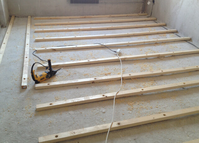 - Укладка лаг на бетонный пол не представляет значительных сложностей.