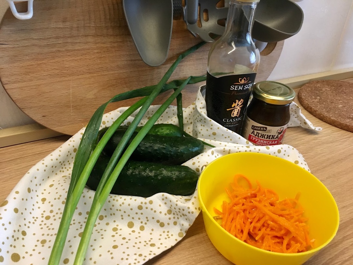 - Перемешиваем огурцы, лук, чеснок и добавляем корейскую морковь