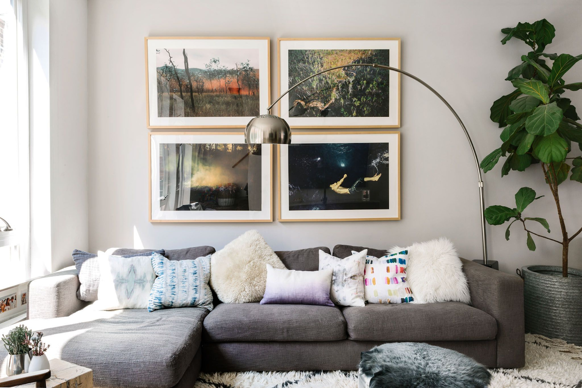 После того, как присмотрели подходящий вариант, купите молярный скотч и очертите им периметр места под будущую картину. Это поможет наглядно увидеть, как она будет смотреться на стене относительно всего интерьера. Если размещаете несколько объектов, сначала скомпонуйте их на полу, затем также скотчем перенесите их контур на стену.