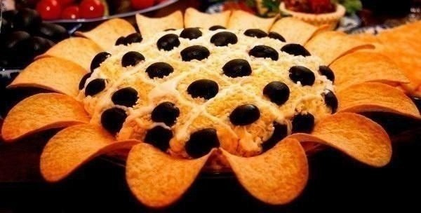 6. До подачи поместить салат в холодильник. Перед подачей к столу украсить подсолнух чипсами.