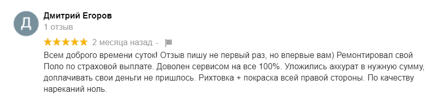 Всем доброго времени суток! Отзыв пишу не первый раз, но впервые вам) Ремонтировал свой Поло по страховой выплате. Доволен сервисом на все 100%. Уложились аккурат в нужную сумму, доплачивать свои деньги не пришлось. Рихтовка + покраска всей правой стороны. По качеству нареканий ноль.