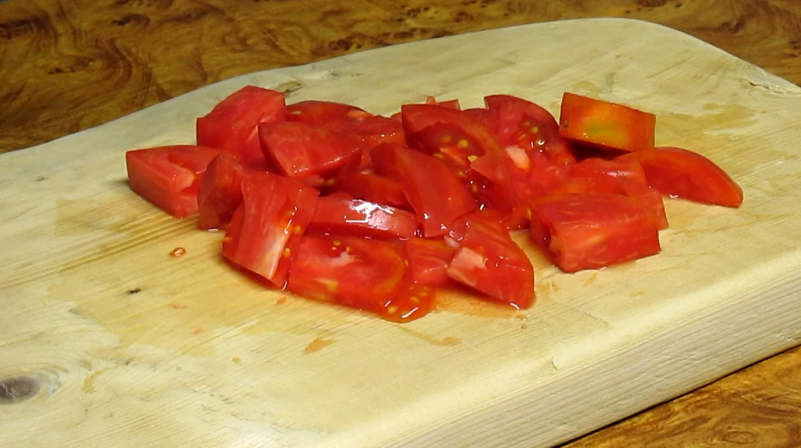 Берём средний помидор и нарезаем его средними кубиками. Так же пока убираем в сторону.