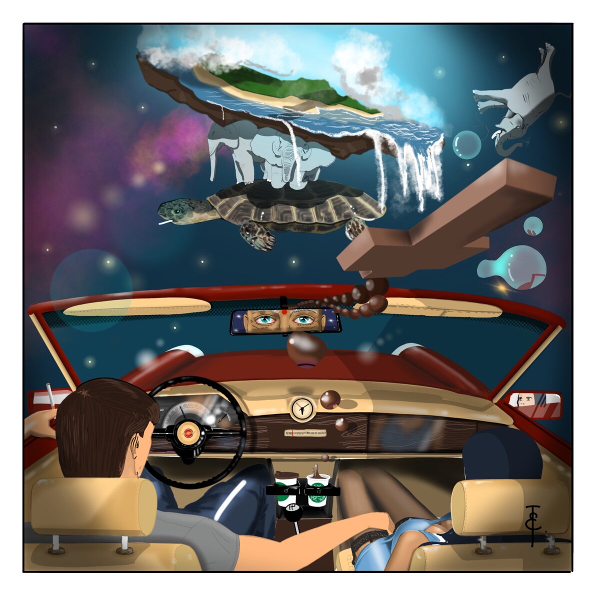 Ему снилось нечто странное. Как будто он в космосе и видит его из-за руля недавно отправленной Маском Теслы, но это была не Тесла, а какой-то ретро автомобиль, с ним рядом сидела Вера и он держал свою руку на ее бедре. Дышалось легко и он даже закурил. Ему снилось, что он видит Землю, но почему-то Земля была не виде шара, а плоская со всем былинным пакетом: три слона и черепаха. Машина плавно парила в сторону диска. Слоны вяло пошевеливали хоботами и хвостами словно отгоняя от себя мелкие звёзды которые мириадами, как мелкие мошки кружили вокруг них. Вера молчала и смотрела в одну точку. В подстаканниках стояло два бумажных стаканчика из Стармакса с недопитым кофе.