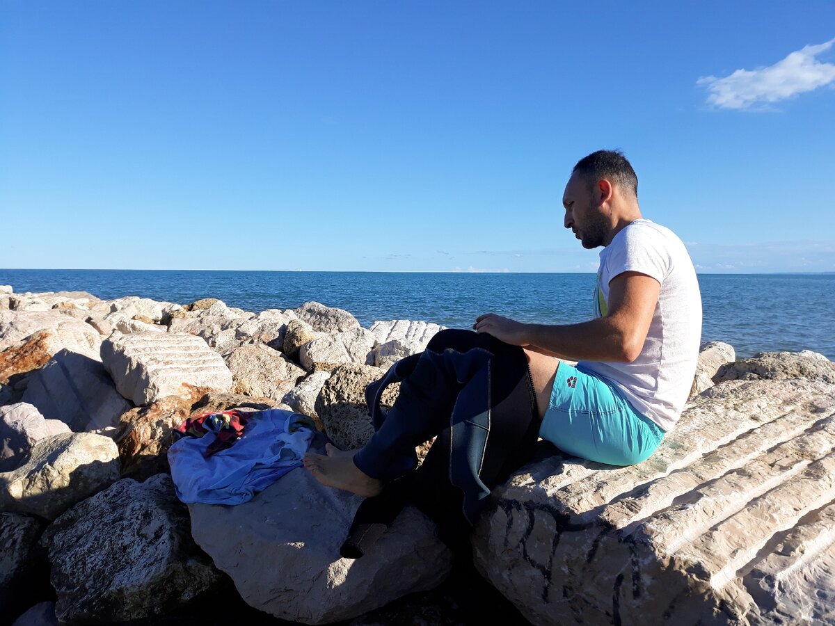 Еще перед переездом к морю, Джо накупил всяких снастей для рыбалки и гидрокостюм, думая что у него будет время на море и рыбалку. Целый месяц я его подкалывала и вспоминала 160 евро, потраченных впустую (60 евро растрелло для вонголе и теллин, 100 евро гидрокостюм). А вчера у нас наконец-то освободилось полдня и мы отправились "отбивать" потраченные денежки.