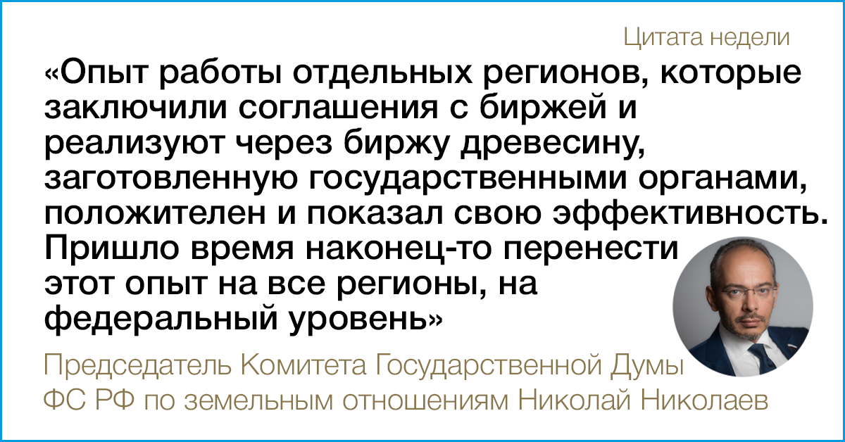 «Тема биржевой торговли в лесной отрасли обсуждается на площадке Государственной Думы уже на протяжении 3-х лет. Опыт работы отдельных регионов, которые заключили соглашения с биржей и реализуют через биржу древесину, заготовленную государственными органами, он положителен и показал свою эффективность. Пришло время наконец-то перенести этот опыт на все регионы, на федеральный уровень. Очень