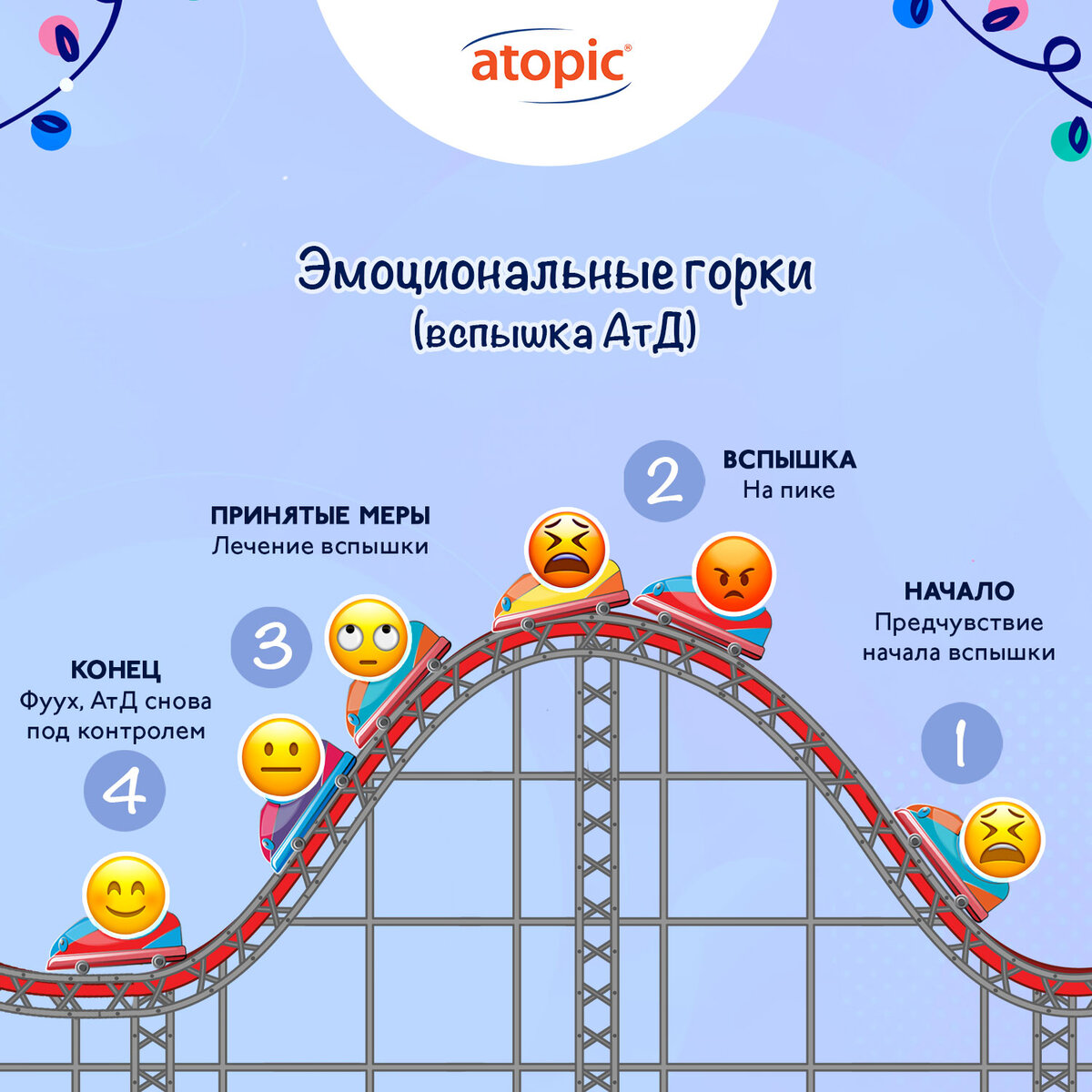 Каждая стадия вспышки АтД способна вызвать самые разные эмоции: от стресса до разочарования, удивления или раздражения... Все это заставляет кататься на эмоциональных американских горках. От внутреннего ощущения, что вот-вот вспыхнет, до уверенной контратаки с лечением.