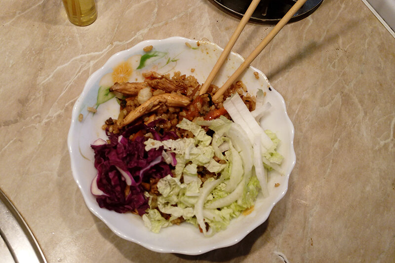 Выложить рис с овощами и курицей в глубокую миску, сверху добавить нарезанную капусту и салатный лист. Рис по-японски с курицей и овощами готов! Есть горячим, вилкой или палочками.