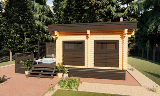 Парная - 5,4 кв. м., душевая - 3,1 кв. м., санузел - 4,1 кв. м., комната отдыха 14,3 кв. м., большая терраса - 24,3 кв. м.