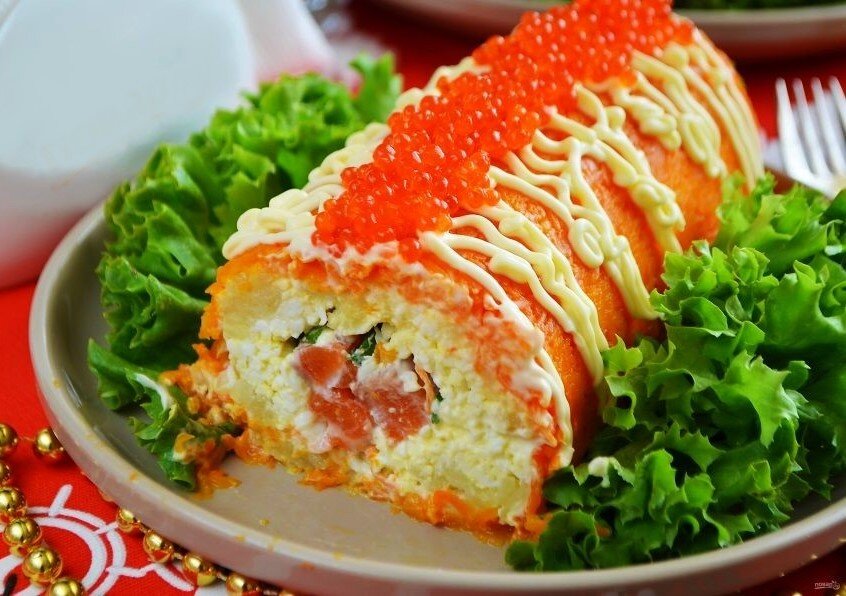 Салат "Царский" лучше всего подходит для большого торжества! Нежная форель и красная икра - по-настоящему царское угощение! Всегда готовлю этот салат на Новый год и Дни Рождения! Гостям особенно нравится, что этот салат сделан в форме рулета! Смотрится очень необычно и легко делится на порции, так что каждый гость не будет обделен рыбой или икрой! В конце статьи обязательно посмотрите наглядное видео с пошаговым рецептом приготовления и подписывайтесь на мой канал #ВкусноИнтересно =) Ингредиенты: 1) В подсоленной воде отварите яйца, морковь и картофель. Когда продукты остынут, очистите их; 2) Морковь натрите на мелкой терке и распределите по поверхности фольги. Смажьте майонезом и присыпьте солью/перцем по желанию; 3) Следующим слоем должна идти тертая картошка. Ее так же следует посолить и добавить майонез; 4) По той же схеме формируется третий слой из тертых яиц; 5) Вдоль одного края разложите красную рыбку, по всей поверхности яичного слоя распределите укроп или зеленый лук; 6) При