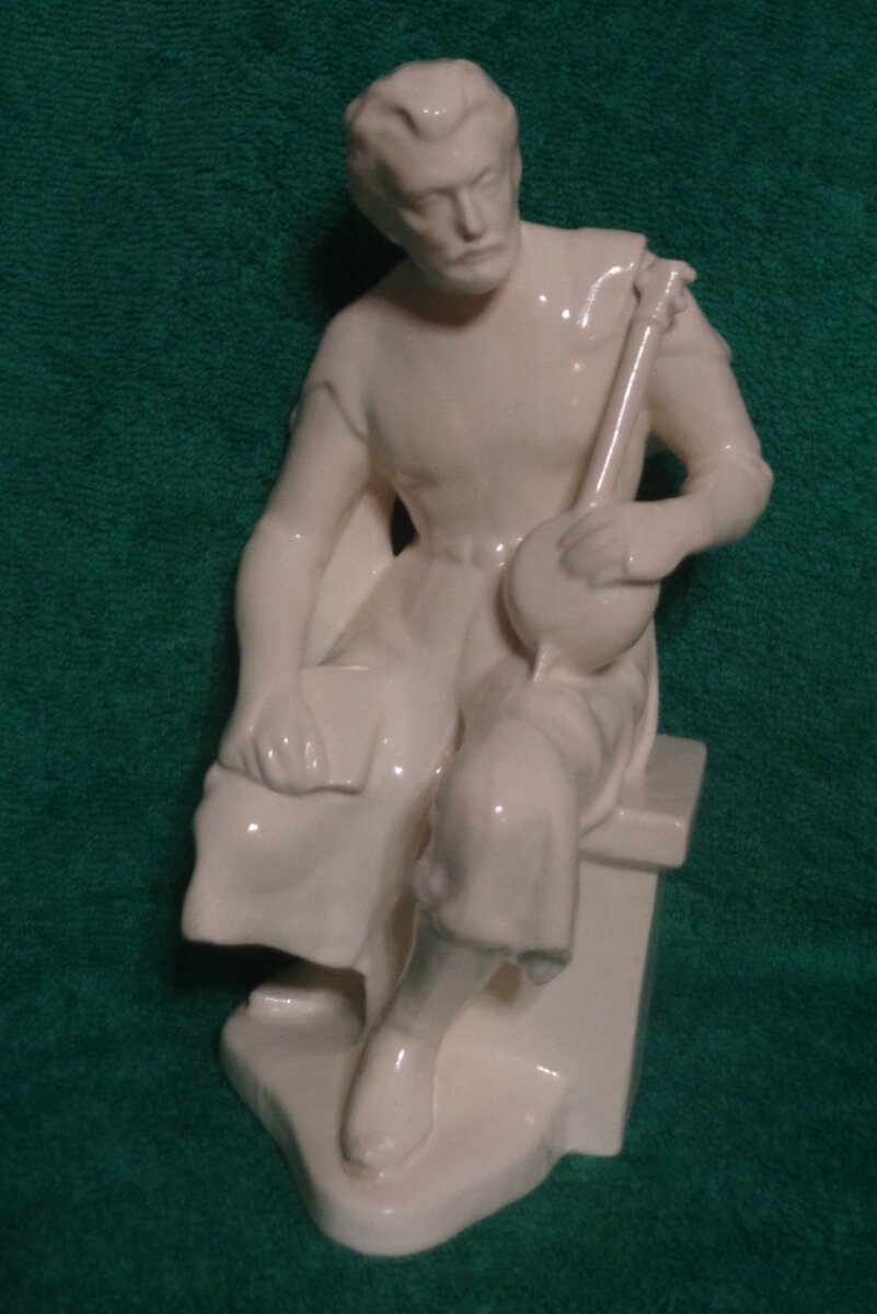 Он поразил меня сразу, с первого взгляда. Такой монументальный; атлетически-сложенный; с чеканным профилем; льдисто-белый и отрешённый; но излучающий какой-то внутренний свет; одухотворённый. Он сидел на цветной тряпице, сжимая в руках "бандуру", возвышаясь над разложенным барахлом, и грустно смотрел на суету вокруг. "Мужик с бандурой" - так окрестили мы его. А было это на блошином рынке, прозванном "Поле чудес", в Сухуме. Я не могла пройти мимо и оставить его здесь, хотя обычно не покупаю такие большие скульптуры (27 см).