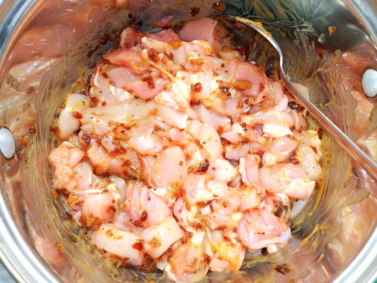 Курятину нарезаем на небольшие полоски, складываем в кастрюлю, заливаем половиной соуса, перемешиваем и оставляем мариноваться на полчаса.