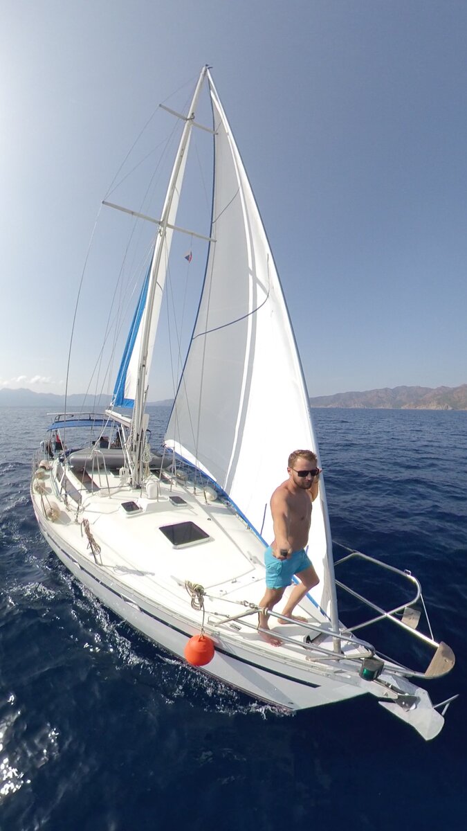 Начинаем готовить лодку к выходу в море. Надраили палубу, заправили танки с пресной водой, запаслись продуктами, питьевой водой и средством от морской болезни 🍷🍾. По прогнозу ветер будет дуть встречный примерно 10 узлов. Выходим из залива Мармарис и встаём курсом на Дальян к острову Delikada, где планируем встать на якоре в ночь. Ветер дует мордавинд, выставляемся правым галсом.