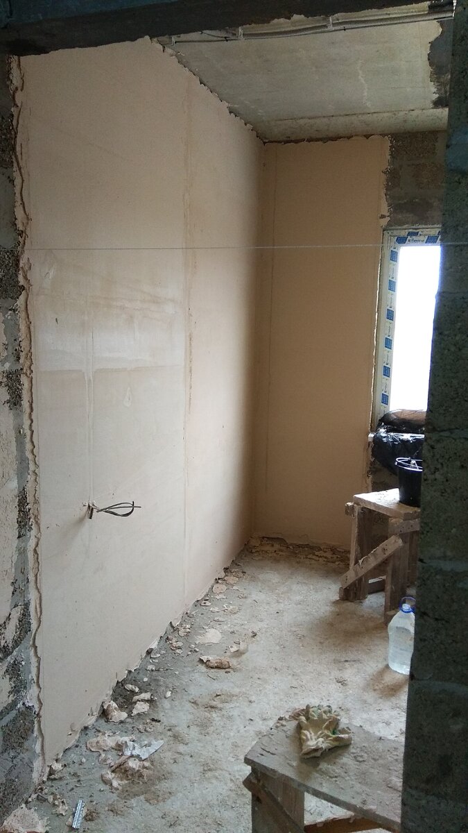 Был вариант наклеивать гипсокартон на стены, но сосед нас отговорил от этого варианта. Оставалось одно - штукатурить самим.