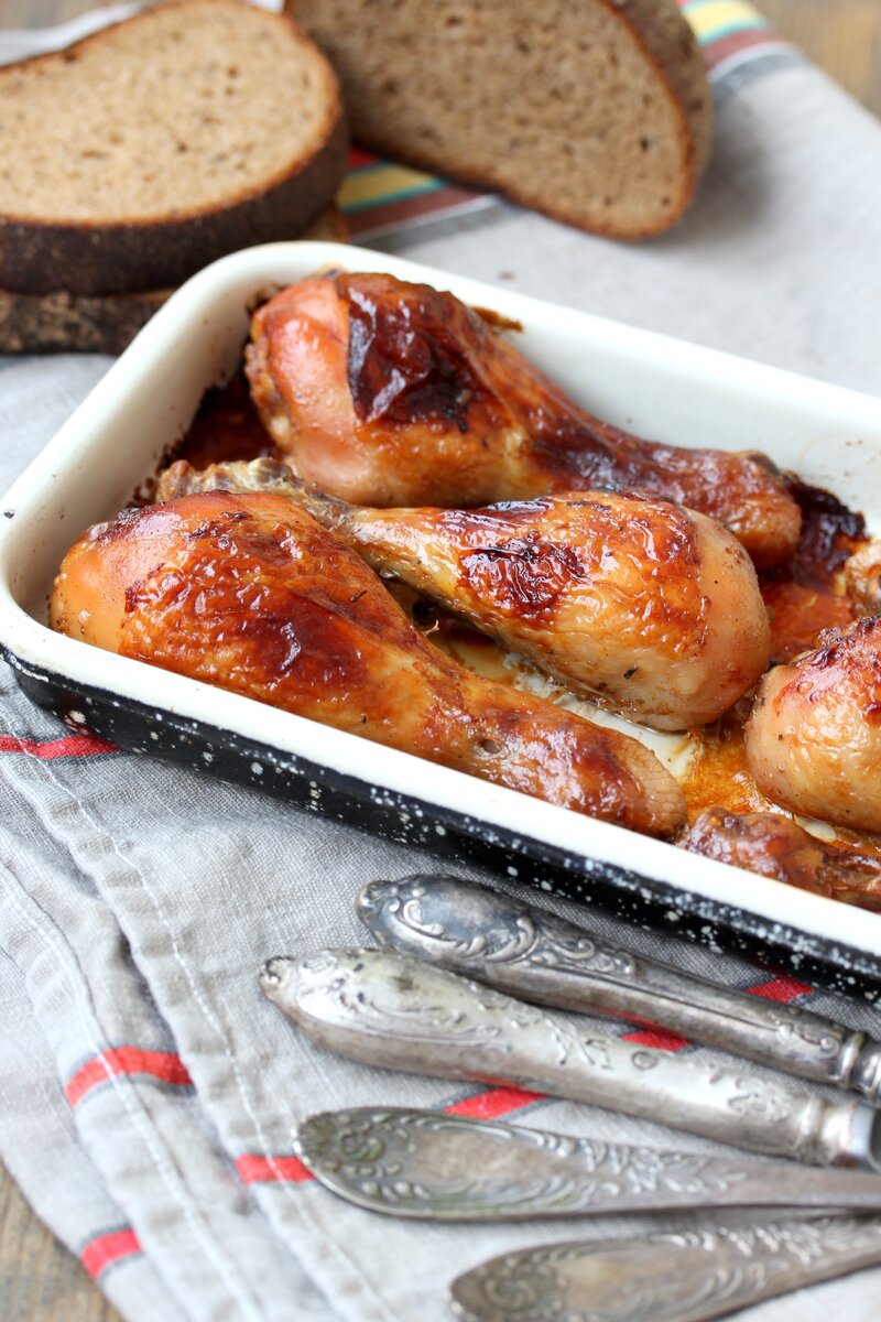 Кто не любит курочку с хрустящей корочкой? я думаю очень многие, я лично люблю. А куриные голени всегда предпочитаю запекать. И вот расскажу про свой секретик, как сделать корочку хрустящей, поджаристой и ароматной. Поскольку я готовлю много варенья, часто бывают остатки. Так вот я добавляю варенье или джем в маринад, немного растительного масла, капельку лимонного сока, соль, перец, травки всякие люблю типа прованских и этим натираю хорошо. Даю постоять полчасика. Помещаю в форму для запекания смазанную маслом и отправляю в разогретую духовку. и периодически обязательно промазываю кисточкой соком со дна. Сначала духовку разогреваю не сильно, минут так 25 так запекаю как томлю, а потом минут на 10-15 включаю духовку сильнее. и постоянно смазываю соком. В общем именно варенье служит как глазурь. сок лимона слегка нейтрализует сладость, корочка получается красивой и хрустящей