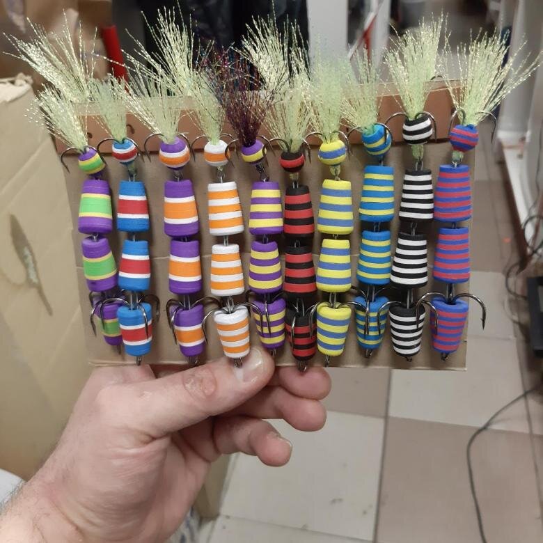 И если говорить о строении, то именно в составной структуре мандулы кроется секрет её уловистости. Обычно самым распространенным набором сегментов при изготовлении мандулы является цепочка из трех пенополиуретановых сегментов. Хотя мне приходилось встречать мандулу, даже из 6 соединенных между собой сегментов пенополиурета. И могу вам сказать откровенно, на счету таких «паровозов» оказывались по настоящему рекордные трофеи. Последний сегмент для большей привлекательности можно оснастить мушкой из люрекса или из шерсти, тут уж на что хватит вашей фантази.
