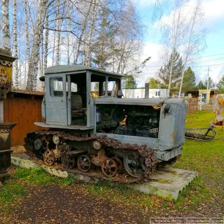 Трактор Т-74 стоит на центральной аллее этнопарка "Околица" в селе Зоркальцево близ Томска.