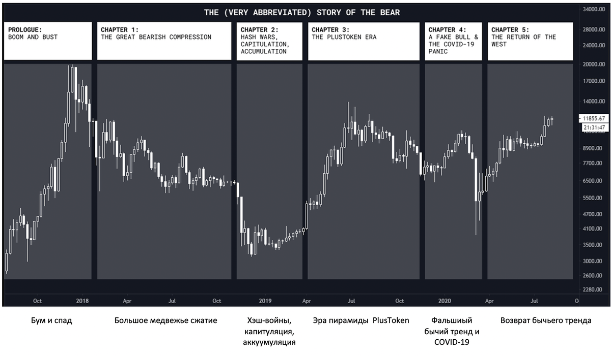 Если оглянуться всего на полтора года назад, у нас были одни из самых интересных рыночных структур в любом цикле BTC. Во время нескольких попыток «типичного» бычьего тренда, два «черных лебедя» один за другим оказали существенное влияние на цену Bitcoin: пирамида PlusToken и COVID-19.