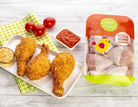 Готовые ножки в хрустящей панировке подавайте с кетчупом.